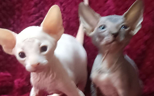 Средние по размеру глаза посажены глубоко. Цвет их радужки варьируется. Большие ушки немного смещены в сторону затылка. Их кончики слегка заострены.