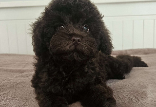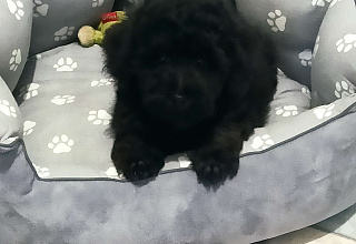 Черная девочка вес 2300, будет до 3 кг, отличная густая шерсть с хорошим завитком, черно коричневое разведение, без белых собак в родословной, окрас будет держать., без брака. Привита по возрасту. Можно гулять, с кошками хопошо, можно в семью с детьми..Приучен на пеленку
