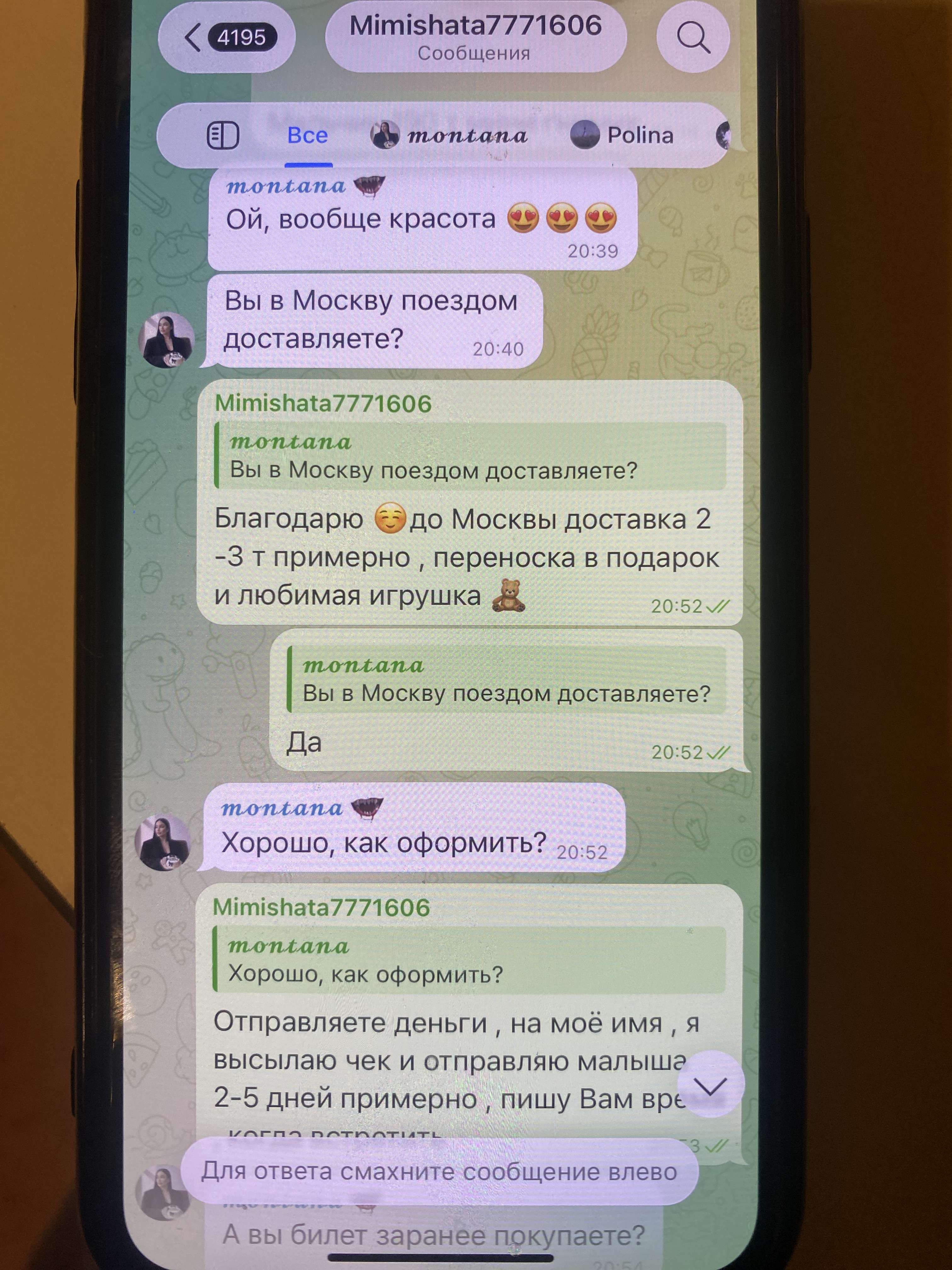 Комментарии: Представившись простым покупателем, выбирающим свою первую собаку, Анастасия в первом же запросе попросила перейти в сторонний мессенджер. Далее общение шло в ключе - хочу то, не знаю что... предоставьте мне фото и видео всего, что у Вас есть. Материалы были ей отправлены, но , Анастасия не сочла нужным их просмотреть и я , в свою очередь, сочла нужным их удалить. На следующее утро увидела на ... Развернуть Представившись простым покупателем, выбирающим свою первую собаку, Анастасия в первом же запросе попросила перейти в сторонний мессенджер. Далее общение шло в ключе - хочу то, не знаю что... предоставьте мне фото и видео всего, что у Вас есть. Материалы были ей отправлены, но , Анастасия не сочла нужным их просмотреть и я , в свою очередь, сочла нужным их удалить. На следующее утро увидела на своей странице жалобу и негативный отзыв с намёком на то, что якобы хотела взять с неё предоплату, хотя речи об этом вообще не шло, и с претензией на то, что удалила свои личные материалы. Странный персонаж... Я бы предостерегла и покупателей и заводчиков от ведения дел с таким конфликтным человеком. Свернуть