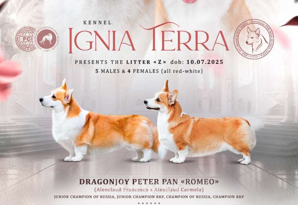 Стандартная девочка вельш корги пемброк в поисках самых ответственных владельцев Игниа Терра Земфира Д.Р. 10.07.2025 Лапка, так мы зовём её дома, нежная, тискательная, смышленая, игривая. А так же очень сообразительная. Она станет самым верным и любящим другом. Буду рада рассказать больше информации о малышке. Происхождение: Sire: DRAGONJOY PETER PAN «ROMEO» (Alenclaud Francesco x Alenclaud Carmela) Junior Champion of Russia Junior Champion of RKF Champion of RKF Champion of Russia ___________________________________________ Dam: Rus Briskazi Flame of Heart «HARTY» (Andvol Kilimanjaro & Rus Briskazi Ognennaya Ledi) INTERCHAMPION Junior Champion of Russia Junior Champion of RKF Junior Club Champion Junior Grand Champion of Russia Champion of Russia Champion of RKF Club Champion Grand Champion of Russia Champion of Belarus Champion of Uzbekistan Champion of Turkish Grand Champion of Turkish 2×Crufts Qualification! 4×CACIB, 2×R.CACIB T-1, NHAT (ТПИ)-2