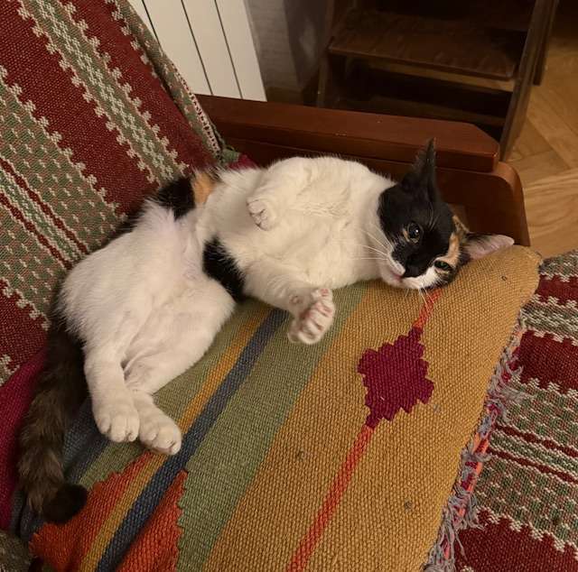 ВНИМАНИЕ: кошечка уехала на испытательный срок в новый дом. Объявление еще пару недель будет активным. Кошечка подросток – Дуня (имя условное, на него почти не откликается) 1 год. Найдена на улице. Малышка сидела вечером на тротуаре и громко плакала. Была очень голодная и замерзшая, но чистенькая, как из дома. Кошечка красивая, трехцветка, говорят - такие кошки приносят счастье. Хочется, чтобы она тоже его обрела в виде старых или новых хозяев. Скорее всего новых, т.к. объявлений о том, что ее ищут – нет. Кошечка очень–очень ручная, постоянно ласкается, облизывает, кошка–липучка. Лоток знает на 5+. Осмотрена ветеринаром. Визуально здорова. Кошечку обработали от кошмариков, стерилизовали, привили, завели паспорт и теперь она с нетерпением ждет свою семью. Сдали анализы на ПАН, ВИК, ВЛК – все чисто. Неделя проживания в прайде на передержке показала, что это кошка–Альфа, т.е. претендует на лидерство. Вычислила глав–кота и начала с ним конкурировать. Однако, с другими - с удовольствием бегает–играет. Кошка активная, прыгучая, поэтому сетки-антикошки на окнах обязательны, возможно из своего бывшего дома как раз и ушла через окно. Улицей очень интересуется - птички, огни машин - это наше все... Очень ориентирована на человека, защищает своего человека, как собака, не хочет делить его внимание с другими сородичами... Она главная, человек только ее собственность. Только она имеет право ласкаться, сидеть рядом, спать рядом, облизывать с ног до головы. Это кошка-собака в одном лице. В связи с этим, возможно, ей нужен дом одной кошкой в семье из нескольких человек, возможно с детьми,но не младше 10 лет, либо в семью к спокойным, не претендующим на лидерство сородичам. И будет всем счастье… Отдаём после небольшого собеседования по телефону, в новый дом привозим сами, наличие сеток-антикошек или готовность их поставить до приезда кошки в семью - это обязательные условия. Предварительное знакомство к кошкой приветствуется.