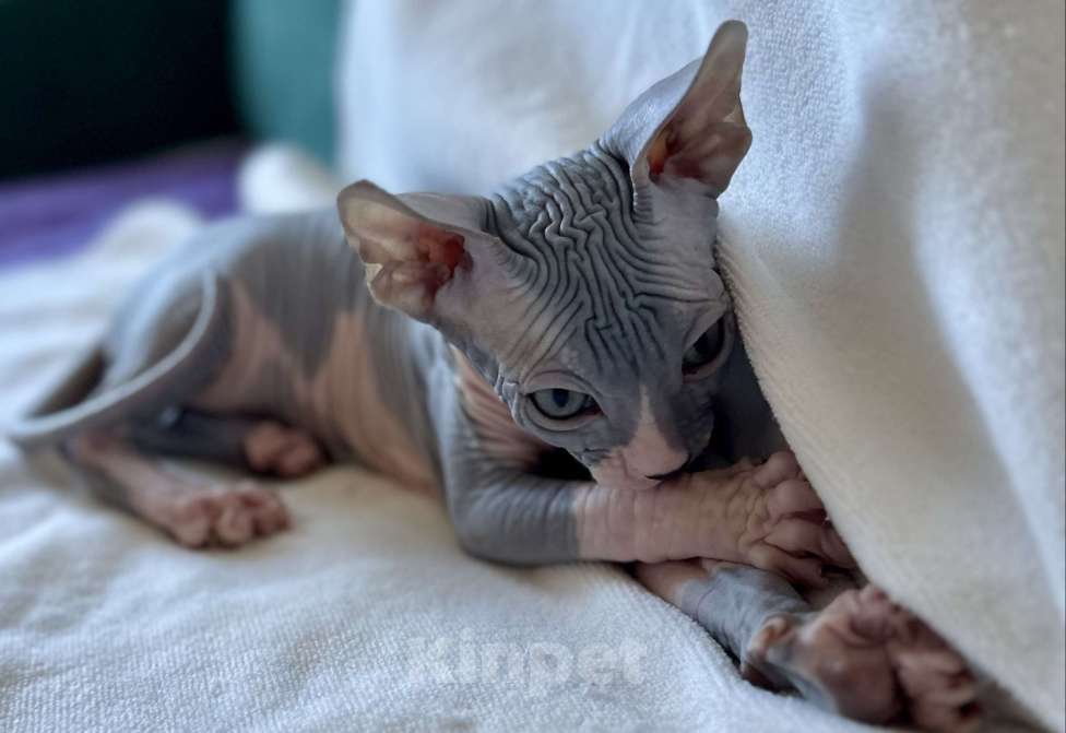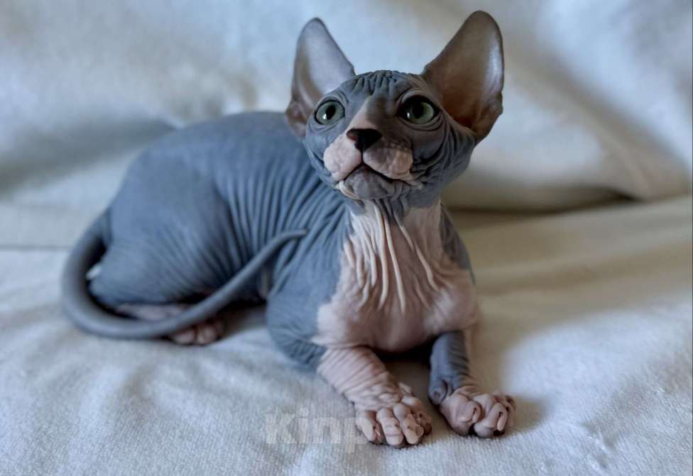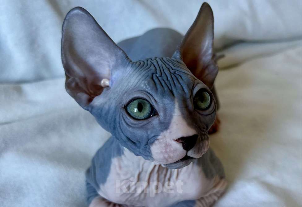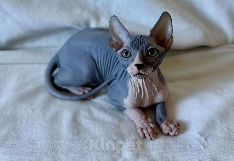 Мальчик голубой с белым, замурчательный, нежный, игривый, ласковый, любвеобильный, полностью голенький, с безумно красивыми глазами котик канадского сфинкса от титулованных родителей, ждёт любящих владельцев, приучен к лоточку, когтеточке, кушает преимущественно сухой корм, как лакомство - влажный