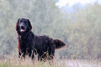 - Прямая шерсть флэтов – результат скрещивания с пойнтерами. Она может быть черной и печеночной (коричневой), но строго однотонной.