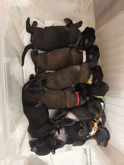 У сенбернаров беременность длится около 63 дней, а в помете рождается примерно 2-12 щенков. Через месяц после зачатия у суки начинает быстро увеличиваться живот. Ее соски набухают, розовеют и немного лысеют. За пару дней до родов из них появляется молозиво – желтоватая жидкость со специфическим запахом.