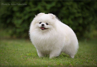 Белая помераночка с короткой мордочкой и отличной шерстью